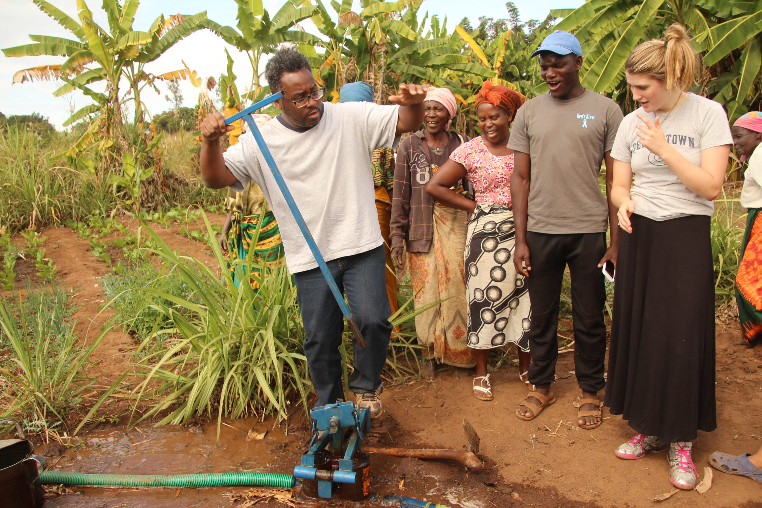 It was an impressive operation, overseen with care and precision by my good friend Frank Mwenjemeka, VIP’s Agricultural Officer. But even more impressive was the amount of work that the farmers had to put in everyday in order to make it profitable. When we got to the field, the 100 plus raised beds had all been made already and many of them had already been planted and fertilized. After just a few minutes of bending down over the beds, measuring the distance between holes and planting the seeds and adding the fertilizer, our team was ready for a break. But we still hadn’t gotten to the hard part, pumping the water using a treadle pump (think a barebones Stairmaster that uses human leg power to create suction to draw water along a hose) to irrigate the raised beds.