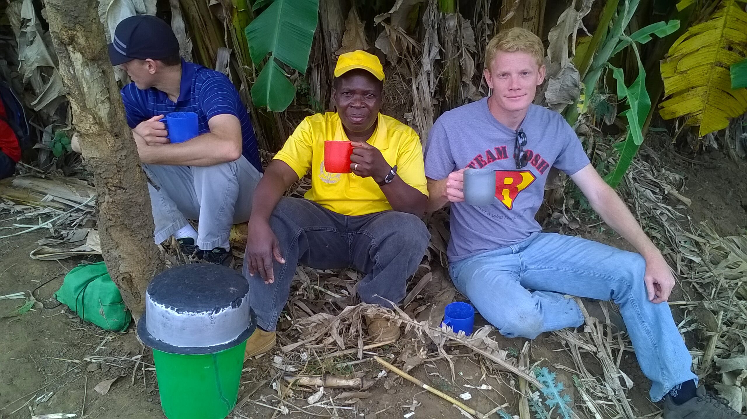 While the river is nearby, the field lies uphill from the Naisi, and so pumping the water takes a great deal of energy. Our team decided on a system where we would each pump as hard as we could for 30 seconds before stepping off the pump and allowing the next person in line to go. This seemed to be the most efficient method, we could tell by checking the pressure of the water shooting out from the various leaks along the hose line, but after twenty minutes or so we were all exhausted and Frank called for a break. We walked around the grove of banana trees separating the river from the field to see how much of the field we had irrigated, and were disappointed to find that we had only watered 5 or 6 beds.